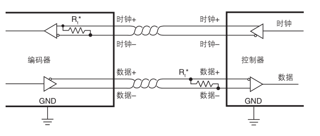 * 時鐘和數據傳輸線均為5 V RS422兼容差分雙絞線。時鐘傳輸線的端接電阻集成在編碼器內部。